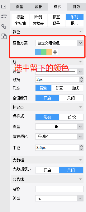 节点色和系列色其实已经是一个颜色,不过有个白色空心,显的清楚,可以在系列-点样式选上实心样式: