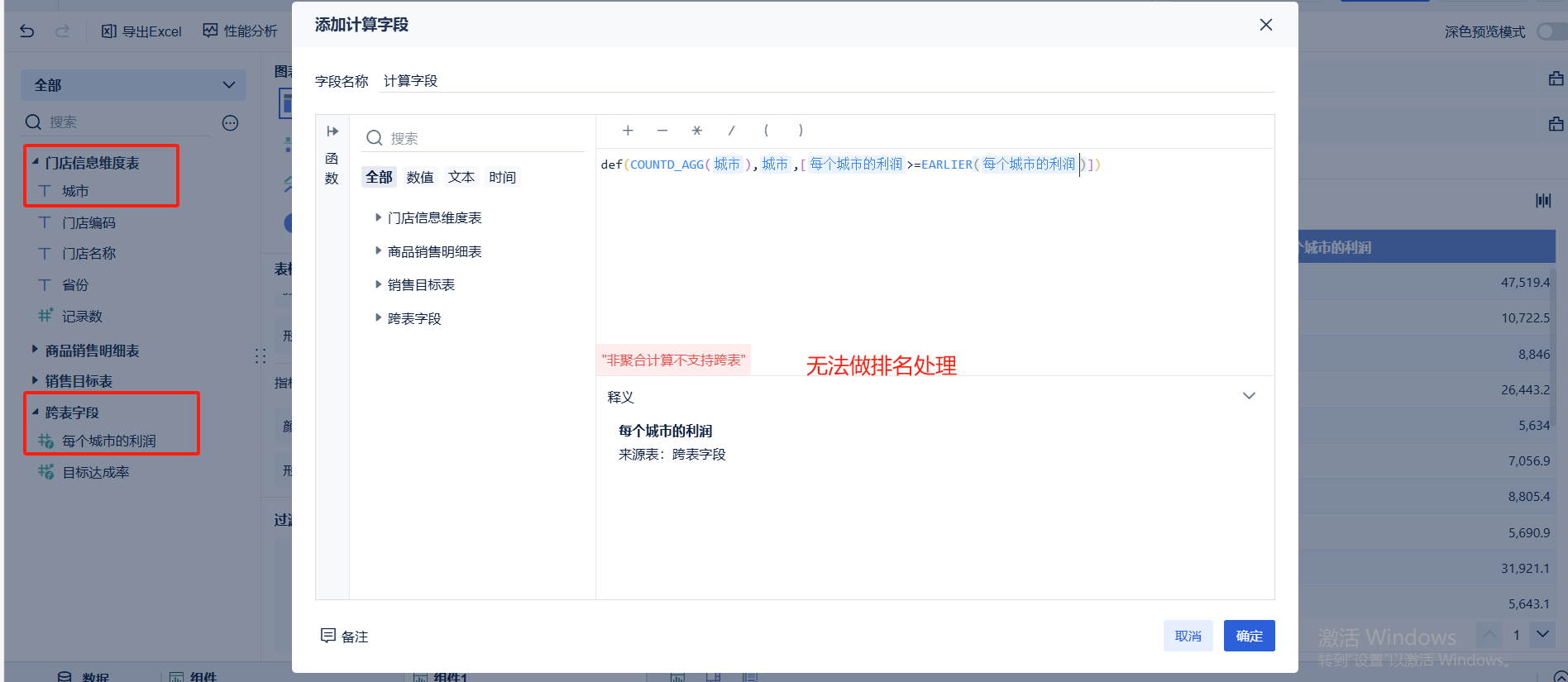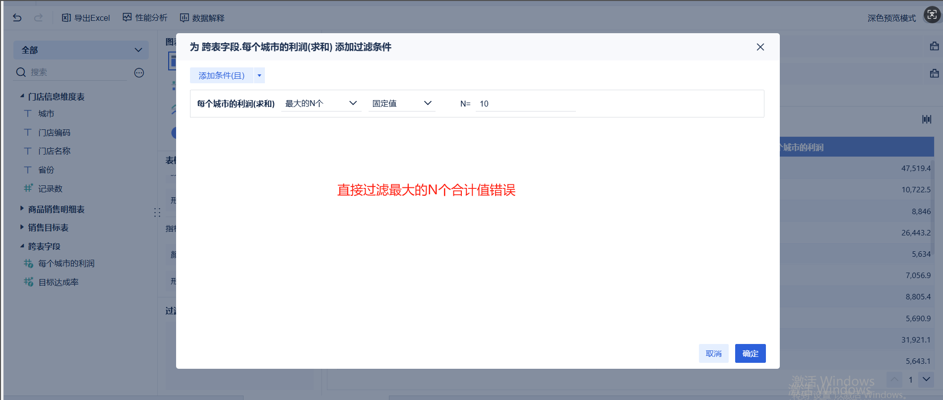 只在分组表组件中操作,跨表求利润前10的城市利润和合计值。 试过排名处理不了跨表,试过直接过滤
